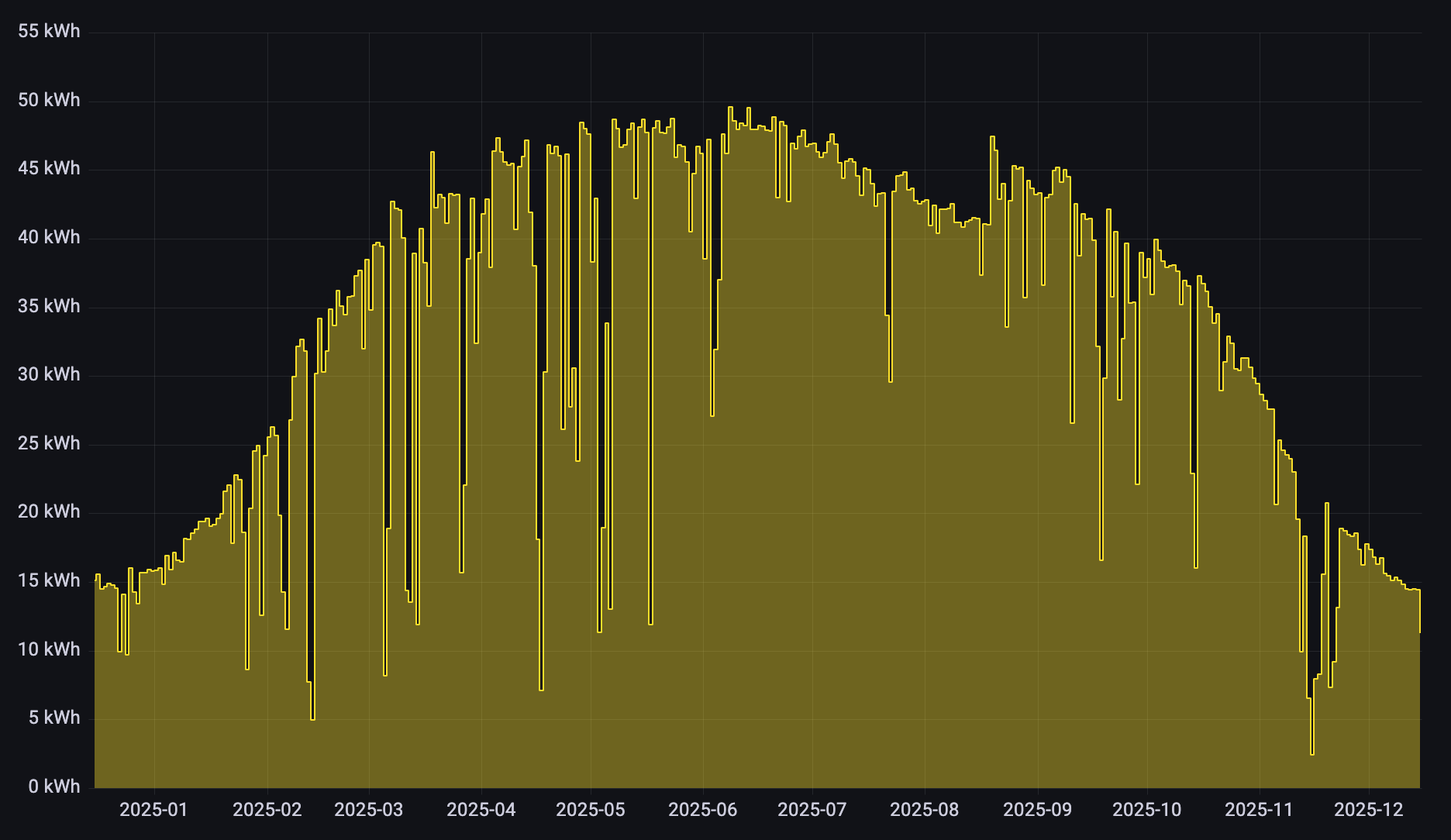 I love data visualization! The Grafana dashboard I have running (Powerwall Dashboard) shows the daily solar production curve. This year, we reached 52kWh/day during the summer. But right now, it’s barely reaching 15kWh/day. Such a dramatic difference! That’s right, there isn’t a lot of sun right now.