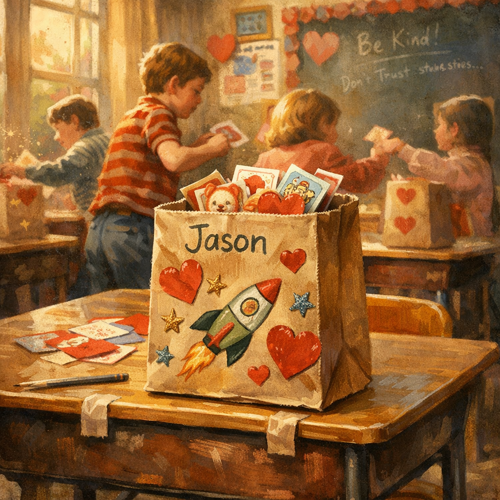 It was Valentine’s Day week. The teacher started passing out brown paper lunch sacks to all the kids in class. Everyone was told to put their names on them (something I often forgot to do, even on tests!) and then decorate the sacks with crafting supplies.