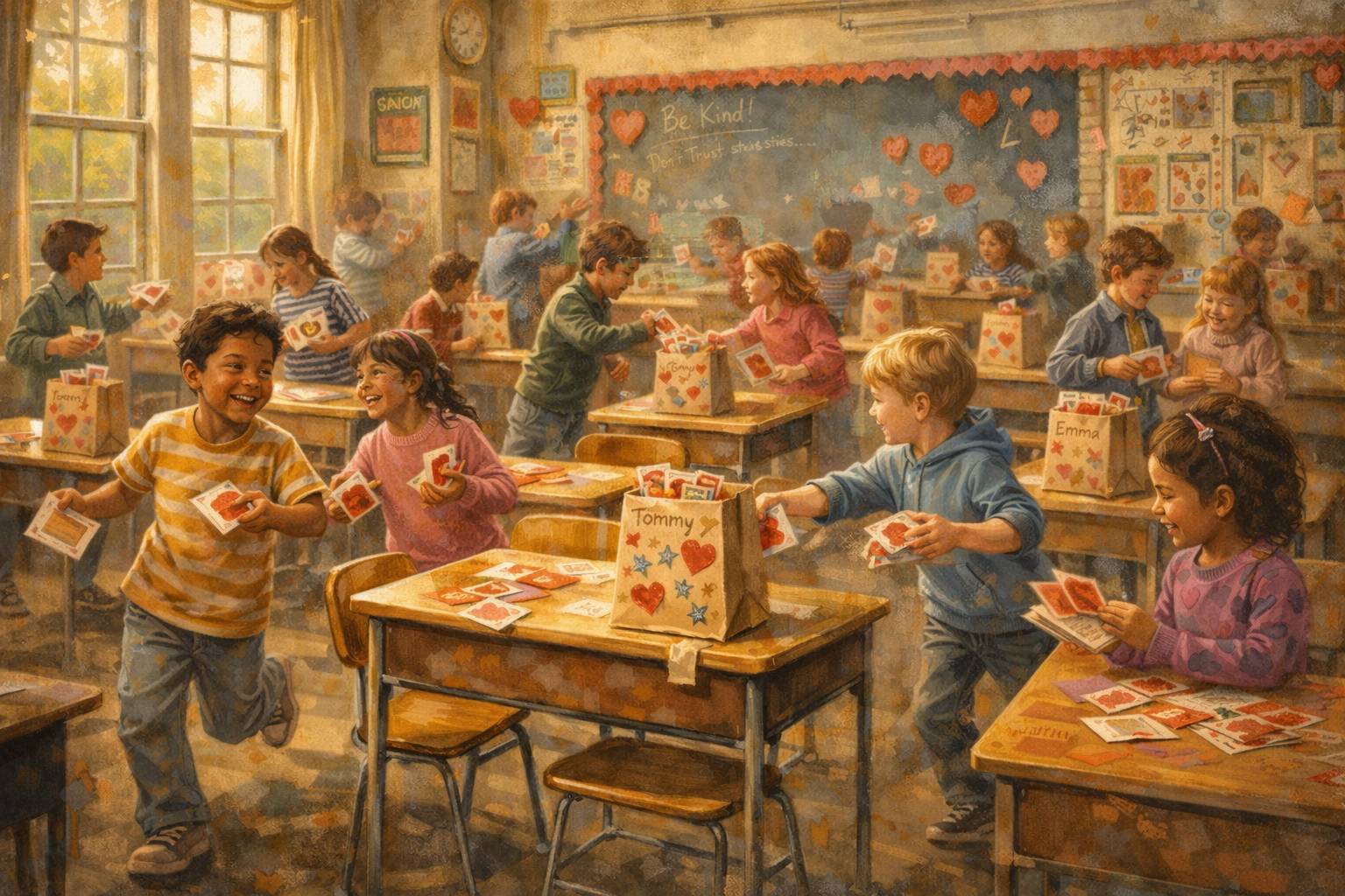 Whenever kids move, their vocal cords move too. They can’t help it. I can still hear that happy childhood chatter in my mind. We’d bump into each other, racing to pass out the mass-produced, nearly microscopic, 24-for-a-dollar Valentine’s cards to everyone in the room.
