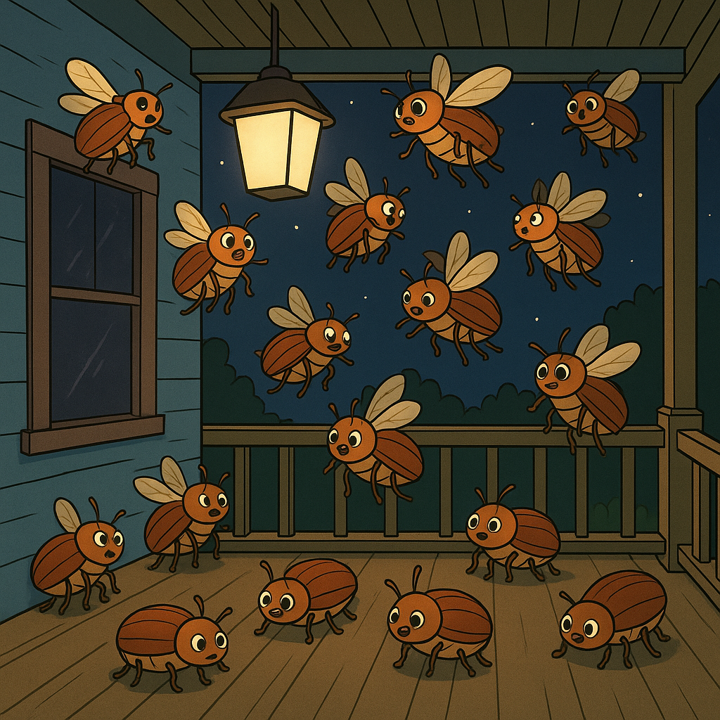 June bugs! Growing up in the South, about this time of year, windows, porch lights, and even sidewalks would be covered with little nickel sized brown beetles called June bugs. I can still hear their little exoskeleton wings buzzing as they make their clumsy and erratic flight between porches, streetlights, and other illuminated areas. They are terrible flyers. They will zoom right into walls, screens or windows causing them to bounce and crash to the ground. They often land on their backs, with their wiggly little legs pointing straight up, frantically trying to right their rigid little bodies. I remember laughing at them as they would scurry around.